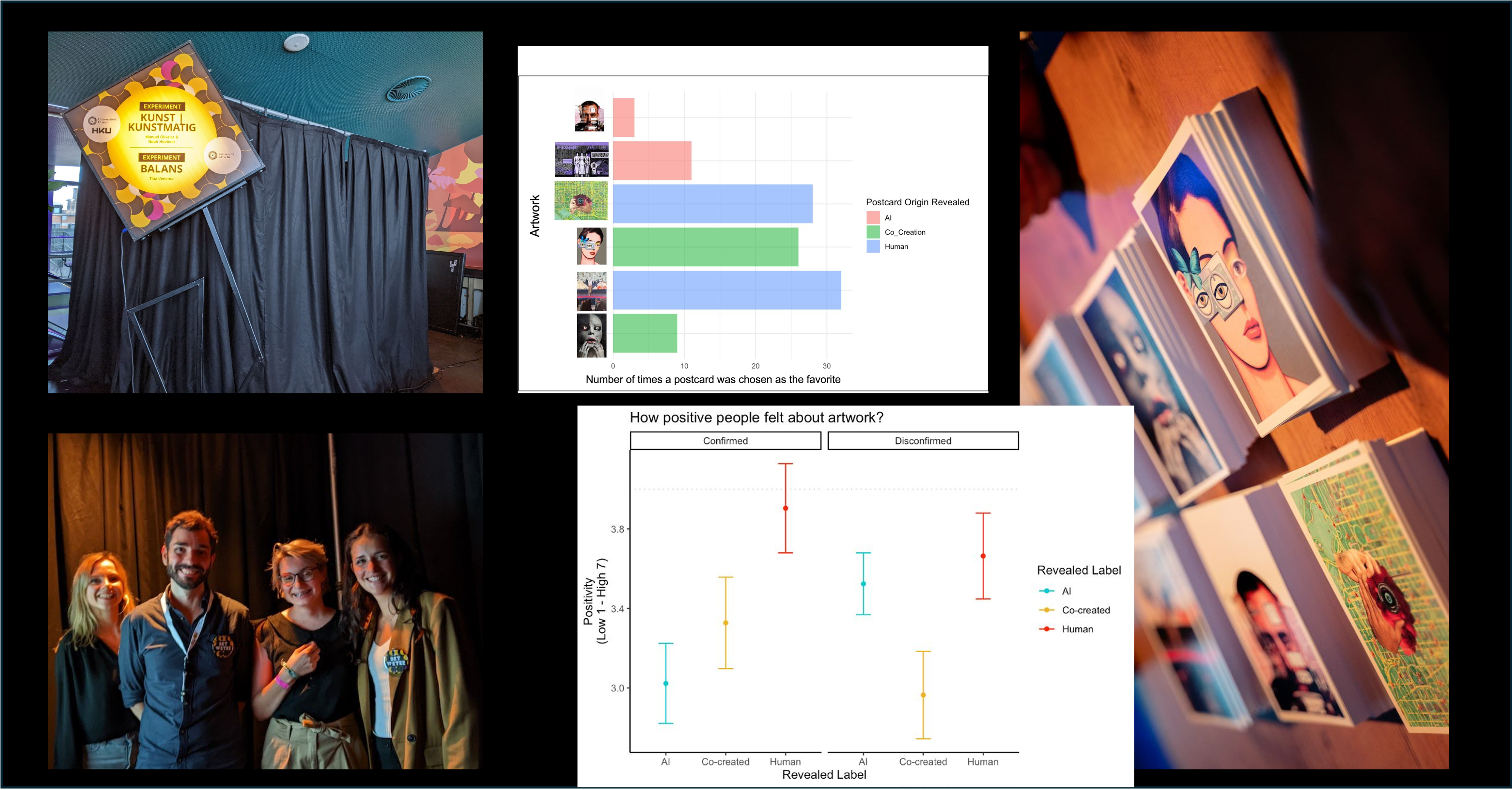 Our preliminary results (see images) revealed that when expectations about the creator of the artwork were confirmed (guessing human when it was human), people evaluated human-made art more positively than CO-created or AI-generated art. When expectations were disconfirmed (guess human but it was AI), people evaluated Co-created art more negatively than both AI or Human-generated art. Regardless of these findings, most people preferred to take home a postcard of the human-made artworks.